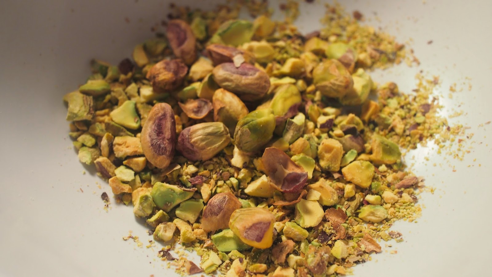 2) In the mean time, grind pistachios into small chunks. (If you don't have a pestle and mortar or a food processor, stick it in a zip lock and bang it around).